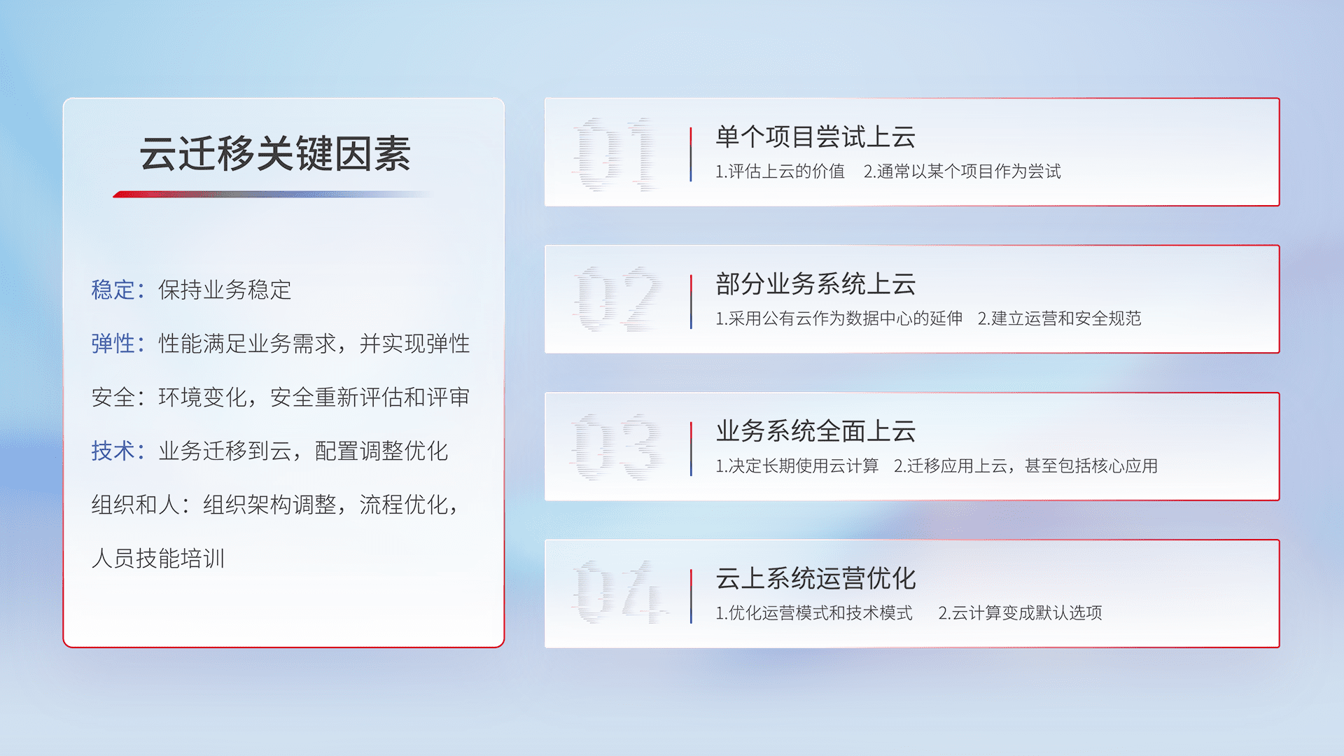结合实际业务,,从规划设计、、、云平台选型、、云原生改造、、、、数据迁移、、、、集成交付,,迁移全过程为客户识别最佳上云路径,,做好风险识别管理,,,设计网络架构、、、、身份权限、、、安全审计合规、、、、操作审计、、、、日志审计、、监控告警策略、、、、多站点容灾设计等,,,,对云上基础设施进行整体规划,,,,提升IT治理水平,,以满足弹性、、高可用、、、、高性能的需求。。