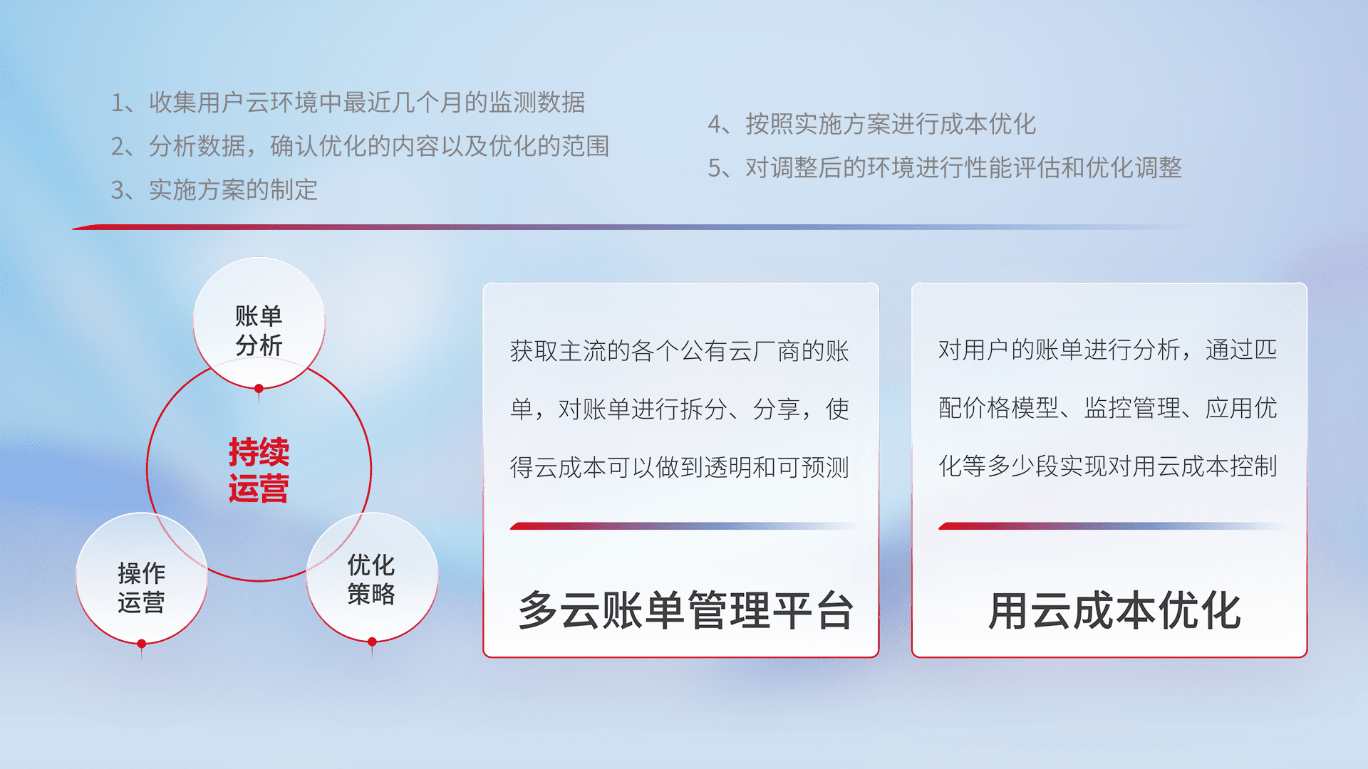 通过多云纳管,,,,以统一的资源数据模型把客户的云资源进行抽象和封装,,,进而实现对多云资源的统一操作,,,保障云资源管理的可靠性、、、稳定性与可用性。。。。量身定制化运维内容,,,配置、、开发运维、、、补丁管理、、备份、、监控、、、、认证和访问管理、、审计和日常巡检等,,,,保障在用云过程中的可靠度,,稳定度以及高可用率。。。